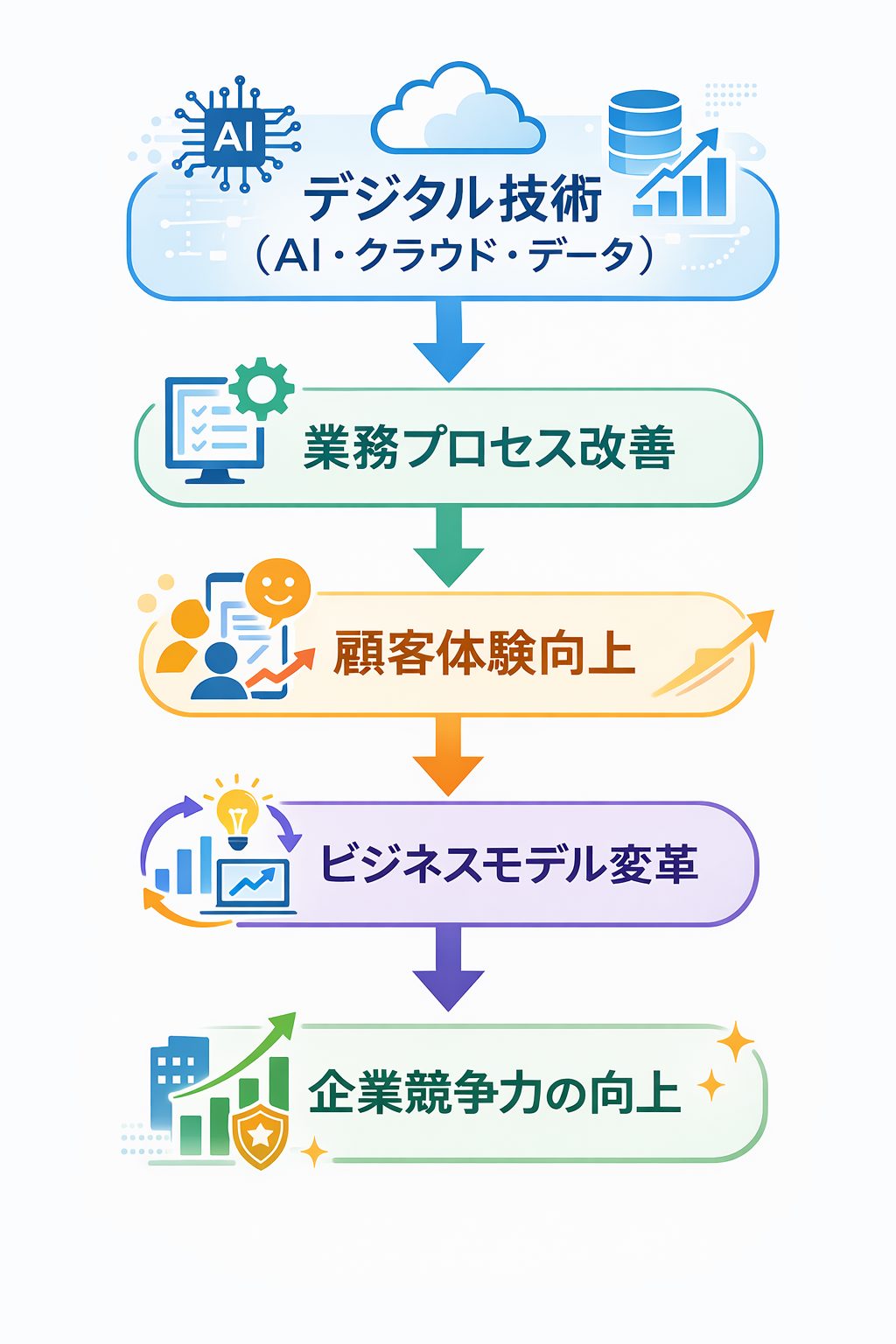 DXは単なるIT導入ではありません。業務プロセス、顧客体験、組織文化などをデジタル技術によって再設計し、企業の競争力を高める取り組みです。